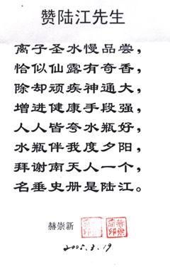 凡尊重中國古代養(yǎng)生智慧的患者,堅持“已饑方食”和定時主動補(bǔ)水者,均可祛病康復(fù)。如牡丹江醫(yī)學(xué)院87歲的張鵬圖飲用半年后高血壓未痊愈,陸江與他通話交流,了解他原先每日主食4兩,建議他用“已饑方食”減少主食肉食量,他理解后,將每日主食減為3兩,少吃兩塊肉,飲用一年治愈26年的冠心病和高血壓。他2003年5月31日來信說:“飲用卓康小分子團(tuán)水是根治高血壓、冠心病、糖尿病的一把金鑰匙,是填補(bǔ)醫(yī)學(xué)空白,為人類造福,應(yīng)推廣該產(chǎn)品。”