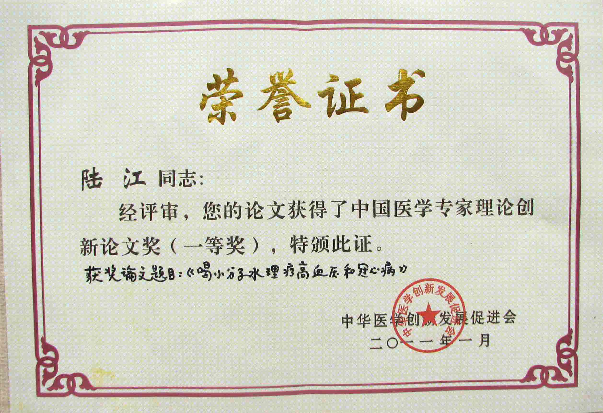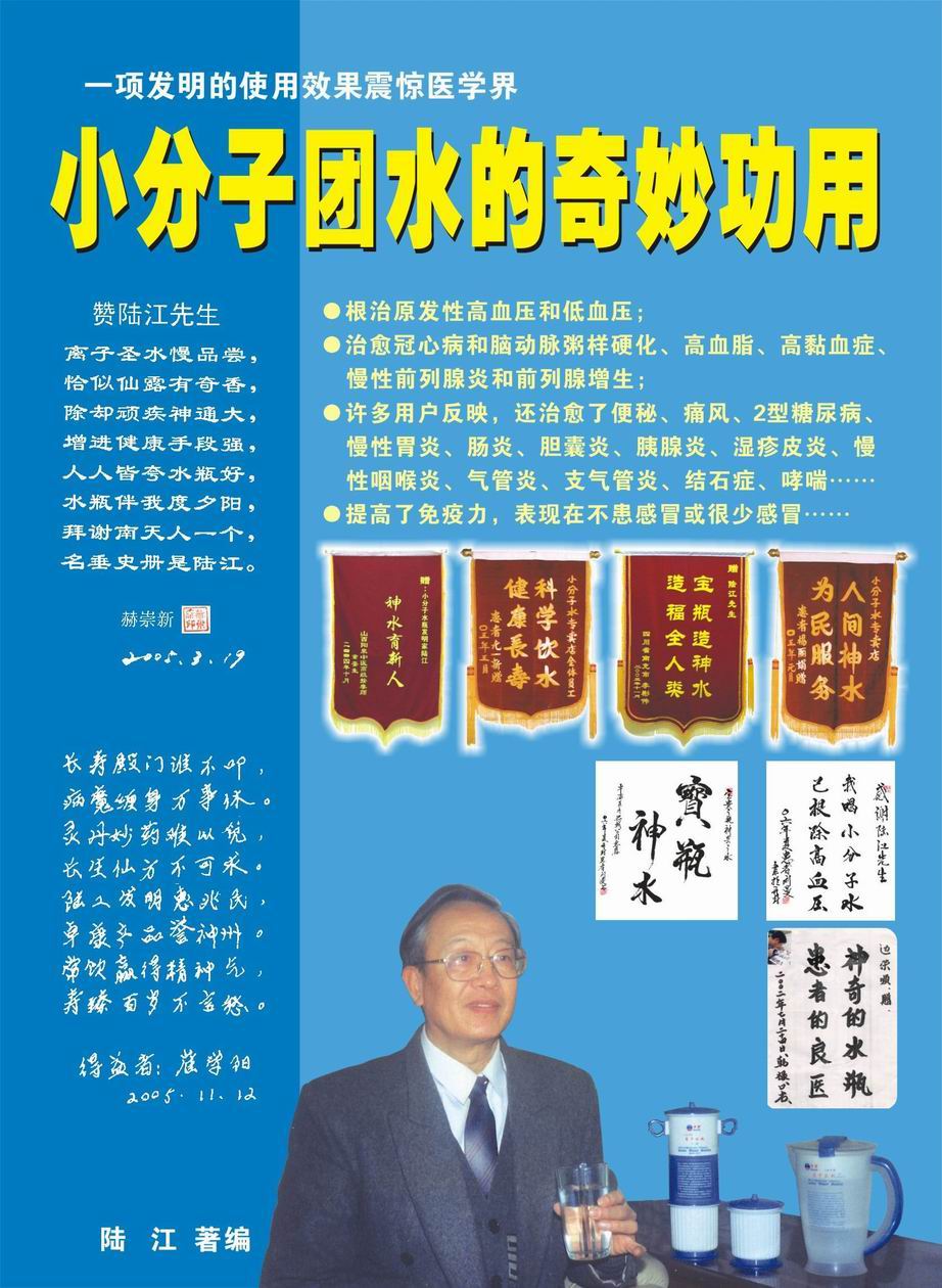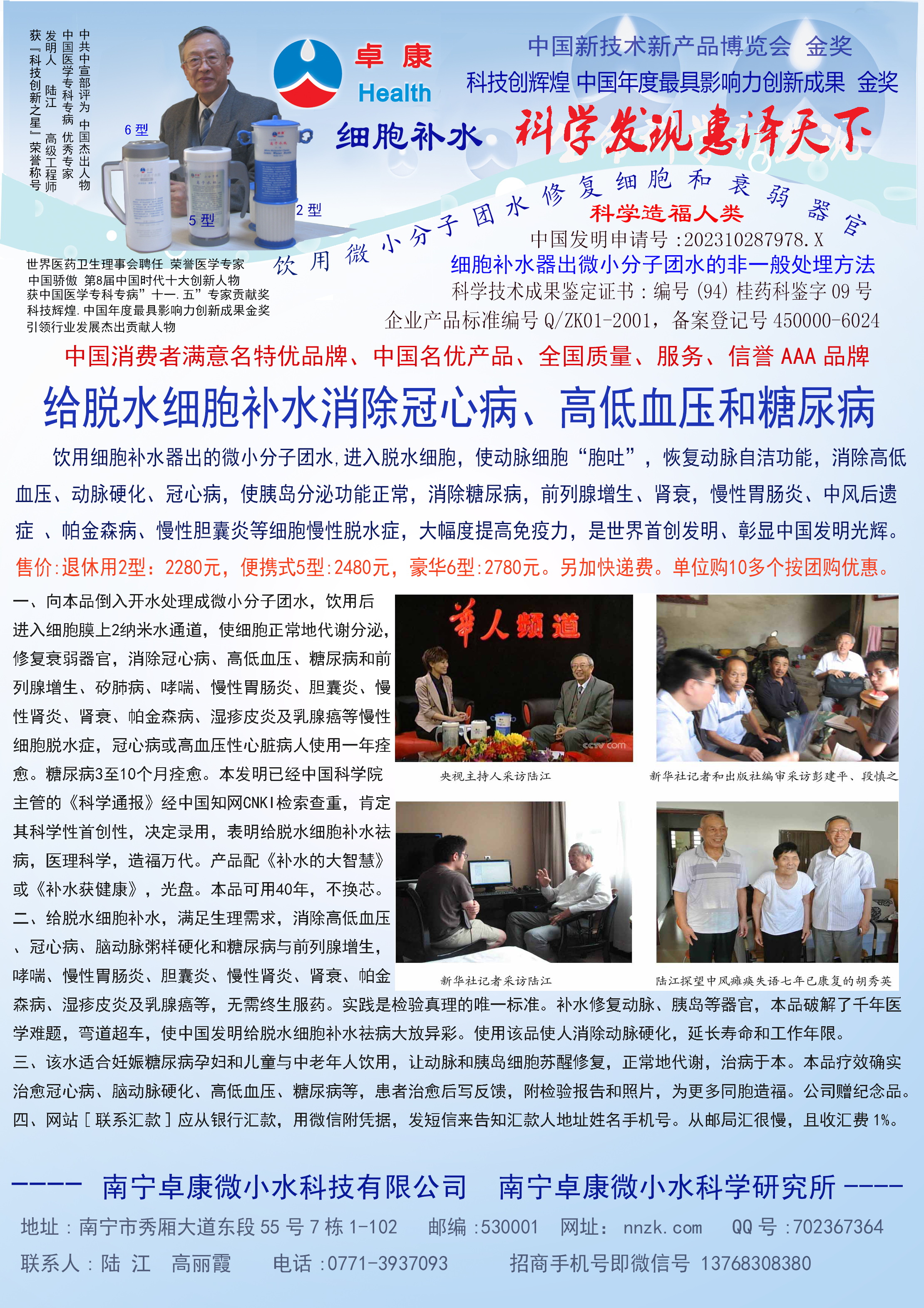 人類幾千年來患以上病癥需終生服藥,幾十年也不能治愈。可是我國南寧的高級工程師陸 江,于1990年想根治高血壓,研究發(fā)明了離子水瓶,處理出微小分子團(tuán)水供飲用,經(jīng)過醫(yī)院臨床試用和專家鑒定,1999年獲中國發(fā)明專利權(quán),產(chǎn)品于2000年投放市場后一直跟蹤調(diào)查,據(jù)全國各地用戶反饋:祛除了高低血壓、糖尿病和冠心病,并使前列腺增生、咽喉炎、鼻竇炎、慢性氣管炎、支氣管炎、矽肺病、哮喘、慢性胃炎、腸炎、慢性膽囊炎、慢性腎炎、腎衰、膀胱炎、便秘、痔瘡、風(fēng)濕性關(guān)節(jié)炎和濕疹皮炎及中風(fēng)后遺癥等病癥不藥而愈。為什么喝微小水能治20多種病?陸 江從1991年德國科學(xué)家發(fā)現(xiàn)細(xì)胞膜水通道僅為2納米獲得啟發(fā),認(rèn)為多種器官患病是因細(xì)胞脫水,不能正常代謝和分裂增殖,才使器官細(xì)胞減少致衰弱萎縮而形成細(xì)胞缺水性病癥。22年來的實踐有力地支持了“細(xì)胞脫水致病”這一重要論點,表明喝微小水可滿足細(xì)胞的生理需求,補(bǔ)水就能祛病,是生命科學(xué)新亮點。